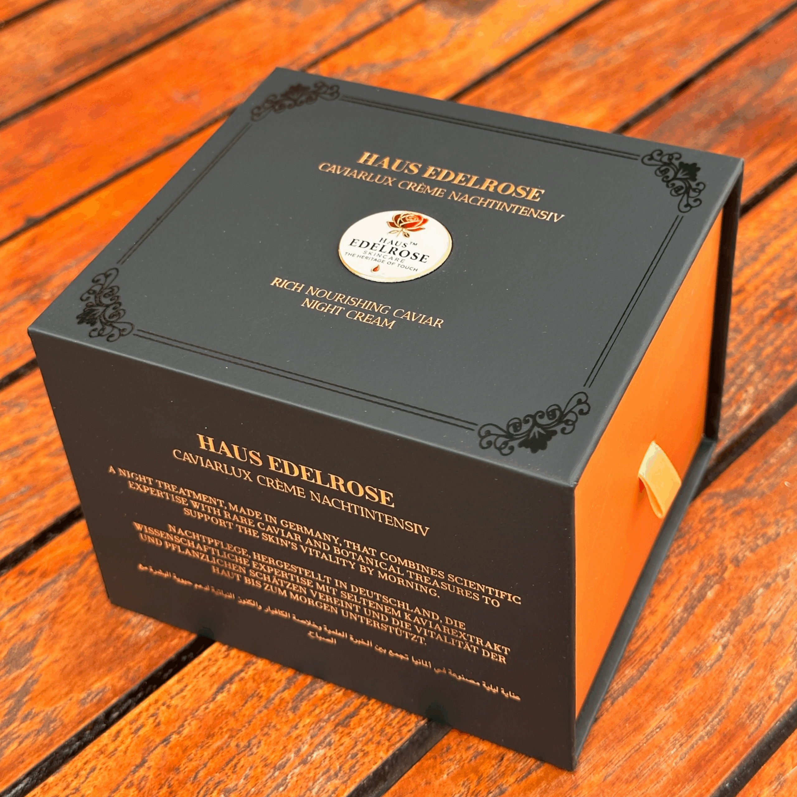 Haus Edelrose™ CAVIARLUX Night Cream is a masterpiece of nocturnal luxury, infused with rare caviar extract, rejuvenating marine peptides, and deeply replenishing botanical emollients.