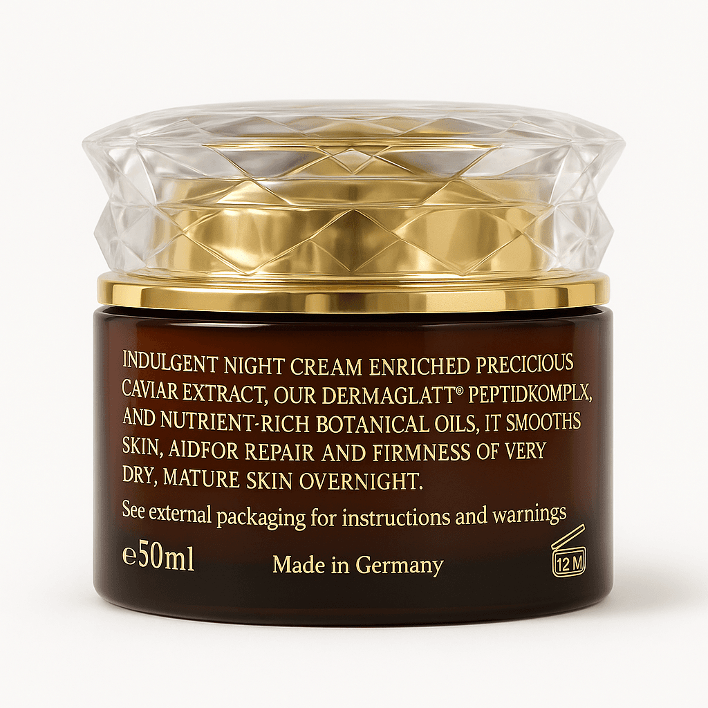 A rich, restorative night cream infused with rare Caviar Extract and rejuvenating marine peptides. Its velvety texture deeply nourishes the skin overnight, enhancing elasticity, smoothness, and vitality. Wake to a visibly renewed, plumper, and well-rested complexion. Dermatologically tested and crafted in Germany for exceptional repair and luxury.