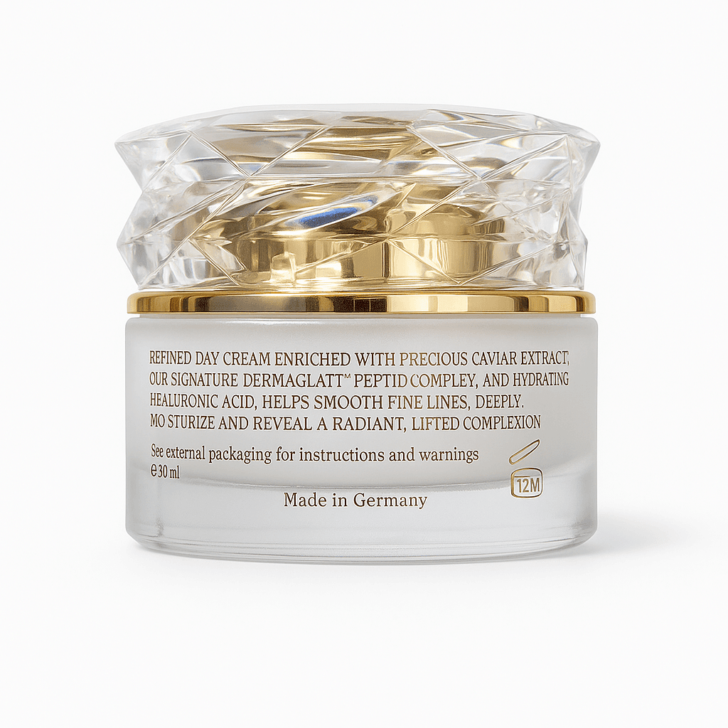 A radiance-enhancing day cream infused with rare Caviar Extract and the DERMAGLÄTT™ Peptide Complex. This sumptuous formula deeply hydrates, smooths fine lines, and restores firmness, revealing a luminous, lifted complexion throughout the day. Dermatologically tested and crafted in Germany for exceptional performance and luxury.